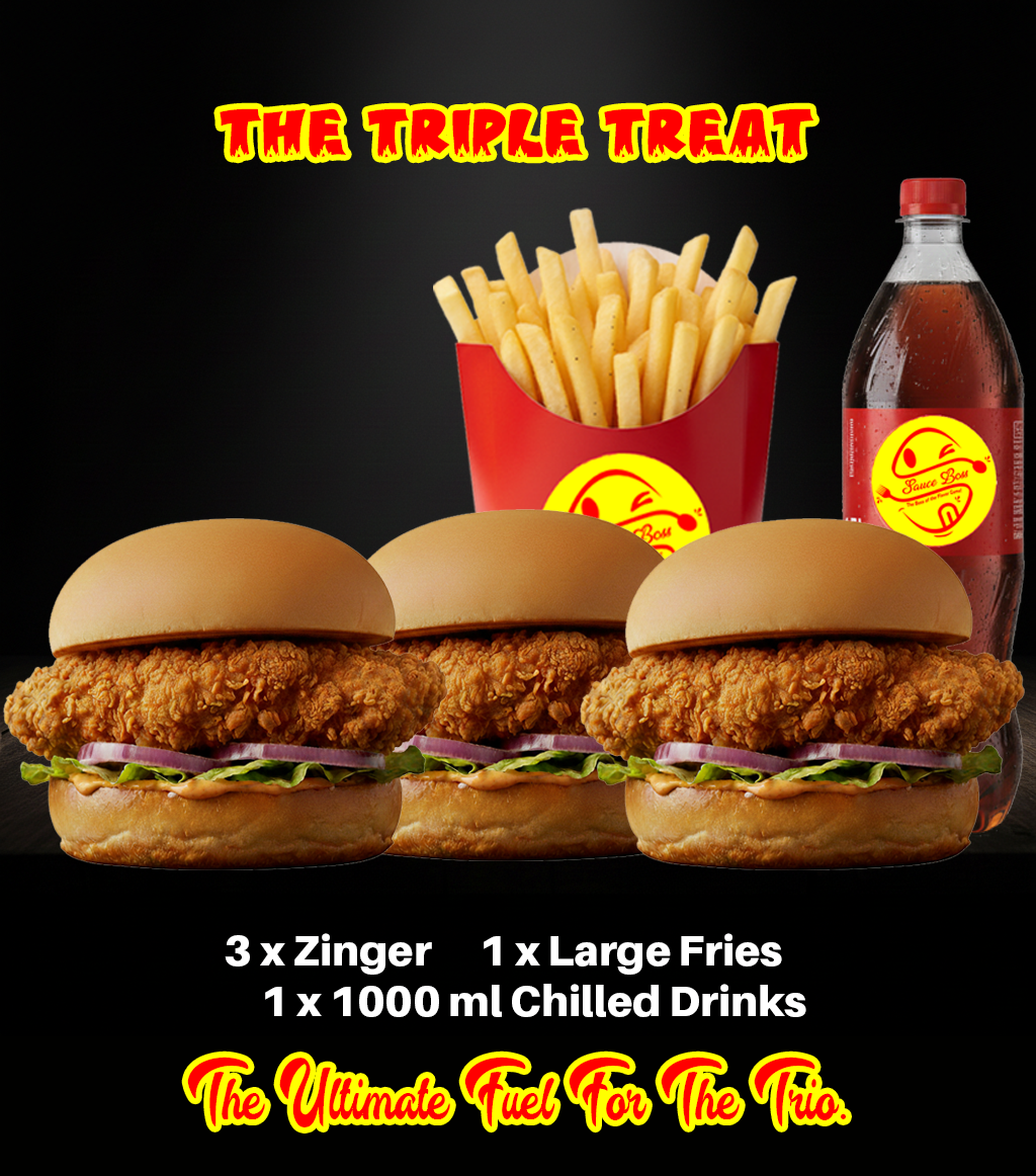 Gather your friends for a meal that defines the “Sauce Boss” experience. This bundle is designed for the spicy chicken purists—those who want the iconic, breaded crunch of a classic Zinger in every single bite. Whether it’s a quick office lunch or a weekend hangout, this spread ensures that no one misses out on our most popular spicy burger. At Sauce Boss, we don’t just serve fast food; we provide a flavor-packed experience that hits the spot every time, ensuring your Triple Zinger Crunch is the highlight of your day.